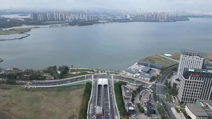 The Second Passage of Dushu Lake (Dushu Hunan Tunnel) is an important component of the "Eight Horizontals" transportation framework system planned and formed in Suzhou City. The project crosses the southern part of Suzhou Dushu Lake, connecting the administrative divisions of Wuzhong District and the Industrial Park. It is connected to Dongfang Avenue to the west and passes through Suzhou Shenwai Port, Dushu Island, Dushu Lake, and Wanshou Street in the form of a tunnel to the east before connecting to Chuangyuan Road. The project has a total length of 3.93 kilometers and adopts the standard of urban main roads. The main line is designed with a speed of 50 km/h. It is China's first underwater navigation canal shaped double layered tunnel, integrating "bridge, island, tunnel, and underwater ramp".