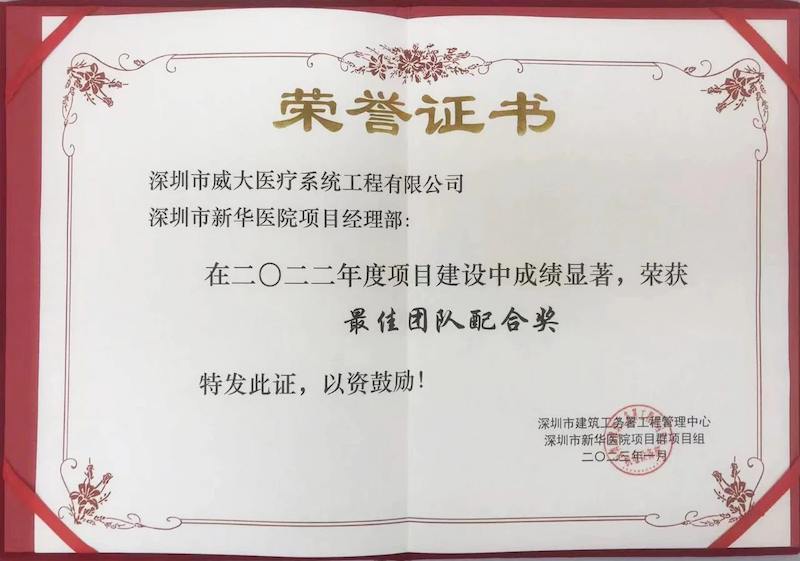 On January 13, 2023, the Engineering Management Center of Shenzhen Construction and Engineering Bureau and the project team of Shenzhen Xinhua Hospital jointly held the "2022 Xinhua Hospital I Project Group Year End Summary and Excellent Commendation Conference". At this conference, Shenzhen Weida was awarded honors such as the "Best Team Collaboration Award" and "Excellent Management Cadre" for its refined management system and practical work attitude. The receipt of these honors is not only a recognition of Shenzhen Weida's outstanding performance in the Xinhua Hospital project, but also an affirmation of its professional strength in the field of smart healthcare.