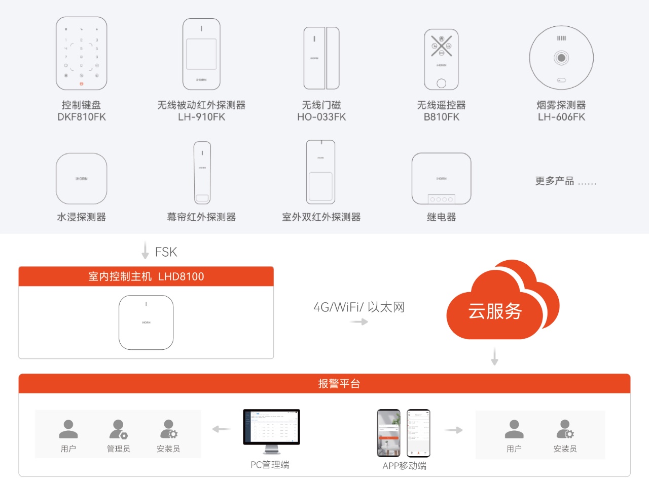 iHORN豪恩致力于打造“更安全、更穩(wěn)定、更靈活”的專業(yè)報警系統(tǒng),系統(tǒng)由報警主機(jī)、前端探測器、報警管理平臺組成。前端探測器一旦探測到異常情況,立即通過FSK通訊方式將數(shù)據(jù)上報至報警主機(jī),主機(jī)再通過4G/WiFi/以太網(wǎng)等方式通知云平臺,現(xiàn)場聲光報警,并將報警信息通過PC管理端、電話、短信、APP等方式遠(yuǎn)程通知終端用戶,保障各類場所人員、財產(chǎn)、物品安全。