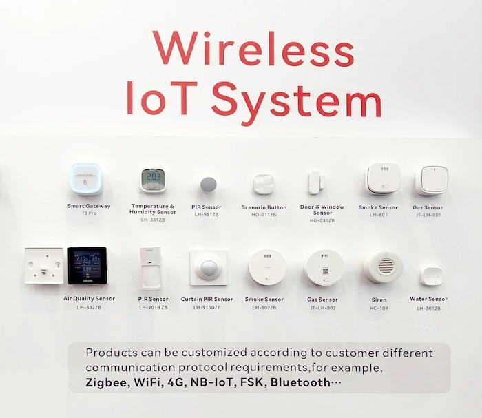 該系列產(chǎn)品主要采用Zigbee無線通訊方式(可根據(jù)客戶需求定制 4G、NB-IoT、ZigBee、WiFi、藍牙、LoRa等其他通訊方式),由T3網(wǎng)關(guān)統(tǒng)一管理紅外、煙感、氣感、溫濕度、門磁、水浸等前端探測器。
