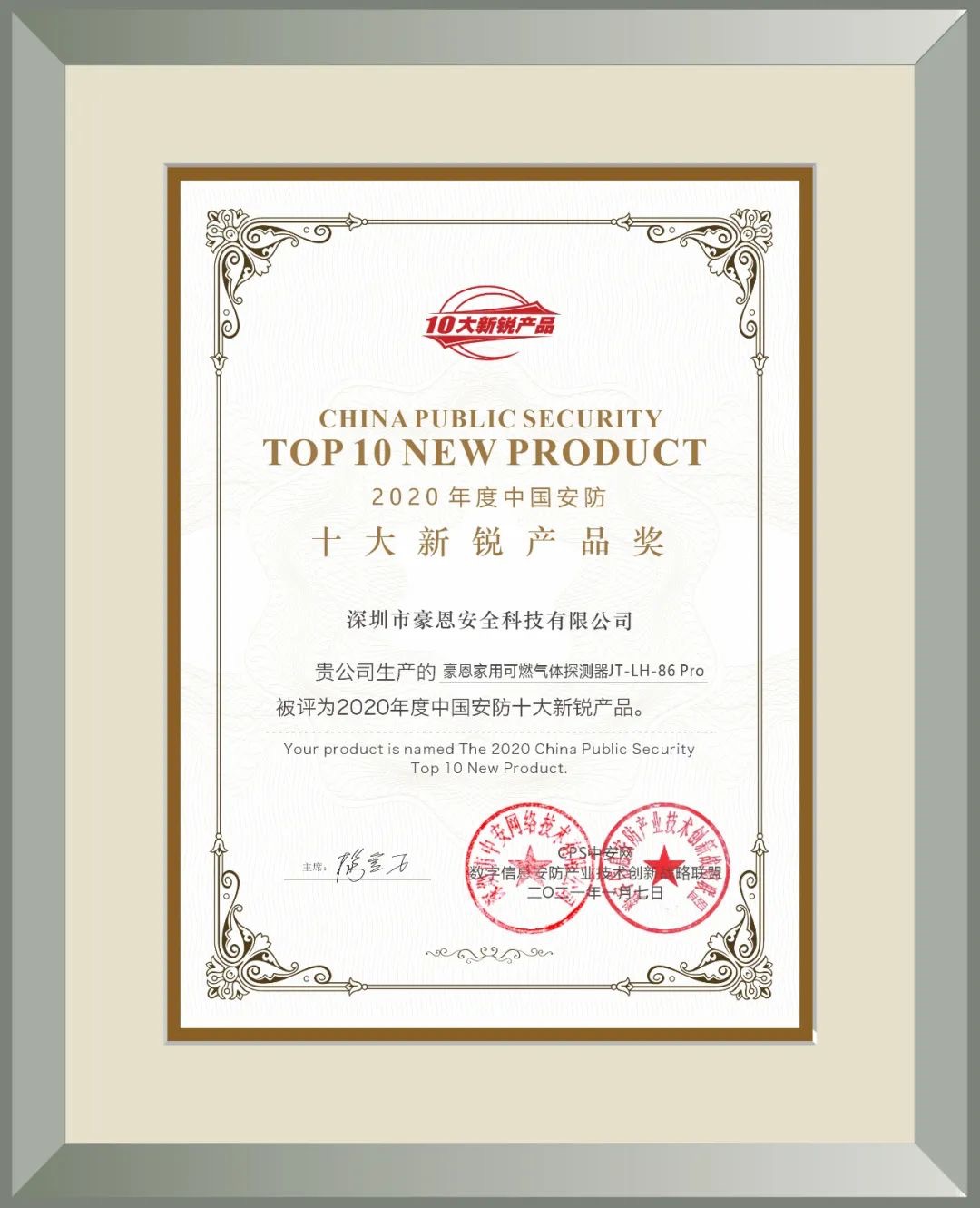 在團(tuán)拜會頒獎典禮上,中安科股份成員公司 — 深圳市豪恩安全科技有限公司(以下簡稱“豪恩”)的家用可燃?xì)怏w探測器 JT-LH-86 Pro 新品,榮獲了“2020 中國安防十大新銳產(chǎn)品”獎項(xiàng),同時入圍的還有??低?、大華、華為、天地偉業(yè)等公司的新品。