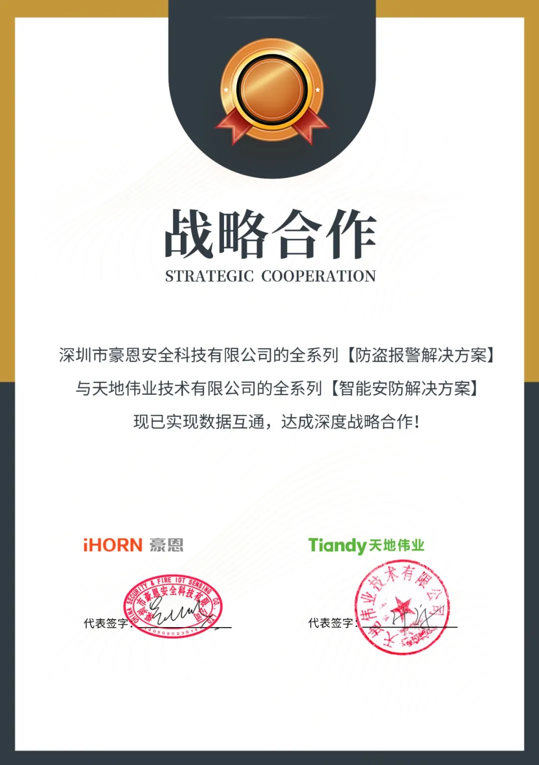 近日,中安科子公司 —— 深圳市豪恩安全科技有限公司(以下簡(jiǎn)稱“豪恩”)的全系列防盜報(bào)警解決方案與天地偉業(yè)技術(shù)有限公司(以下簡(jiǎn)稱“天地偉業(yè)”)的全系列智能安防解決方案已實(shí)現(xiàn)數(shù)據(jù)互通,達(dá)成深度戰(zhàn)略合作!