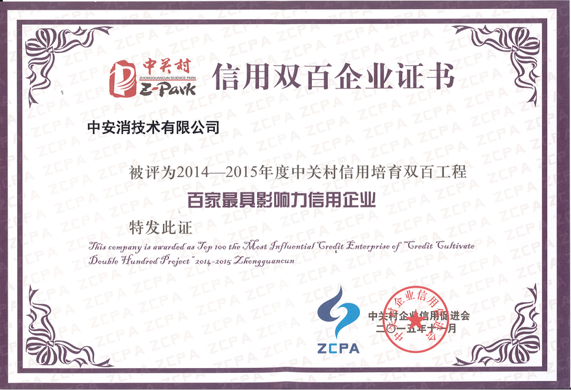 2015年11月17日,中關村企業(yè)信用促進會發(fā)布了“2015中關村信用雙百企業(yè)”獲獎名單,中安消技術有限公司憑借多年積累的社會信任度以及對中關村科技、經(jīng)濟的貢獻,再獲 “2015年中關村信用雙百企業(yè)——最具影響力企業(yè)”稱號。