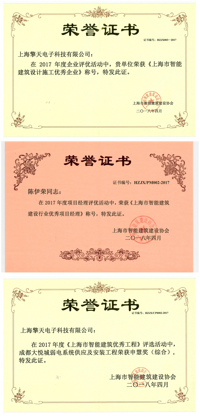 2018年6月25日,上海市智能建筑建設(shè)協(xié)會(huì)評(píng)優(yōu)公布。經(jīng)過現(xiàn)場(chǎng)初評(píng)、專家評(píng)審以及社會(huì)評(píng)議,中安科股份成員企業(yè)上海擎天電子科技有限公司(簡稱上海擎天)共摘得三項(xiàng)大獎(jiǎng),分別是上海市智能建筑設(shè)計(jì)施工優(yōu)秀企業(yè)獎(jiǎng)、上海市智能建筑優(yōu)秀工程-申慧獎(jiǎng)綜合獎(jiǎng)及上海市智能建筑建設(shè)行業(yè)優(yōu)秀項(xiàng)目經(jīng)理獎(jiǎng)。