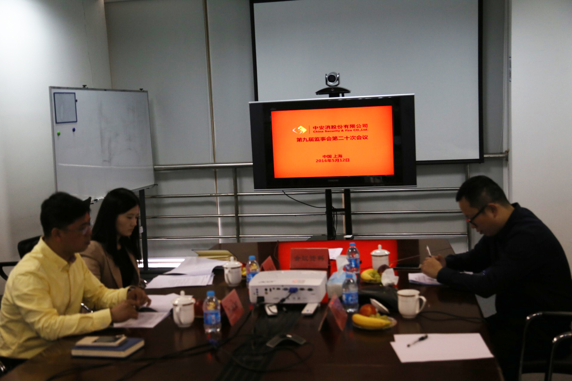 圖2,監(jiān)事會會議現(xiàn)場,左排:監(jiān)事:吳展新(左二)、陳亞南(左一);董事會秘書付欣(右一)。