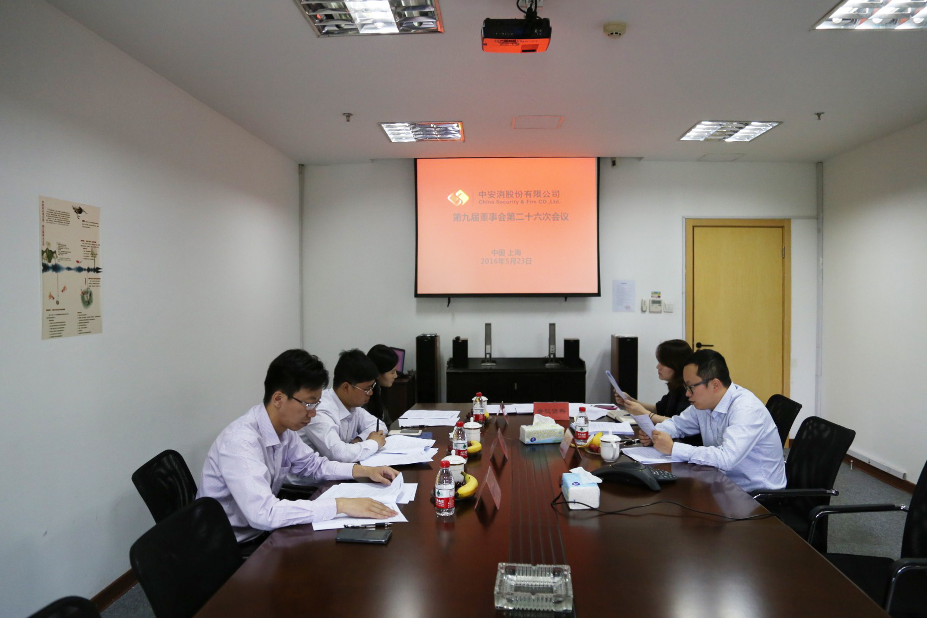 圖2:董事會會議(上海會場):左排:監(jiān)事:王一科(左三)、吳展新(左二)、陳亞南(左一);右排:董事會秘書:付欣(右二)、證券事務(wù)代表:劉小榕(右一)
