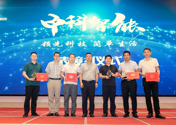 表彰大會上,由中安科股份公司副總裁兼江蘇中科智能總經(jīng)理查磊先生為項目組成員、劉松峰、王永亮、朱浩頒發(fā)了獎杯、榮譽證書及感謝信。