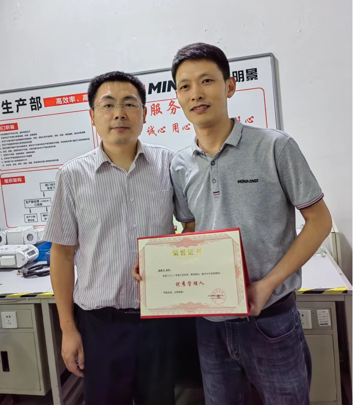 “優(yōu)秀管理人”——朱傳飛,生產(chǎn)部經(jīng)理兼售后服務經(jīng)理,作為生產(chǎn)管理第一責任人,2021年通過帶領(lǐng)技術(shù)骨干調(diào)整工序、優(yōu)化工藝流程(攻關(guān)改進92項)等,極大的提高了產(chǎn)能,與上一年相比,入庫產(chǎn)量提升18.7%、入庫產(chǎn)值提升36%;帶領(lǐng)團隊的售后團隊年度維修及時率96%、維修總量2113件、維修質(zhì)量100%、零投訴、售后服務滿意度100%,并創(chuàng)造了二次銷售與盈利;作為生產(chǎn)安全第一責任人,定期組織宣導安全教育,做到全年生產(chǎn)財產(chǎn)、人身安全零事故。