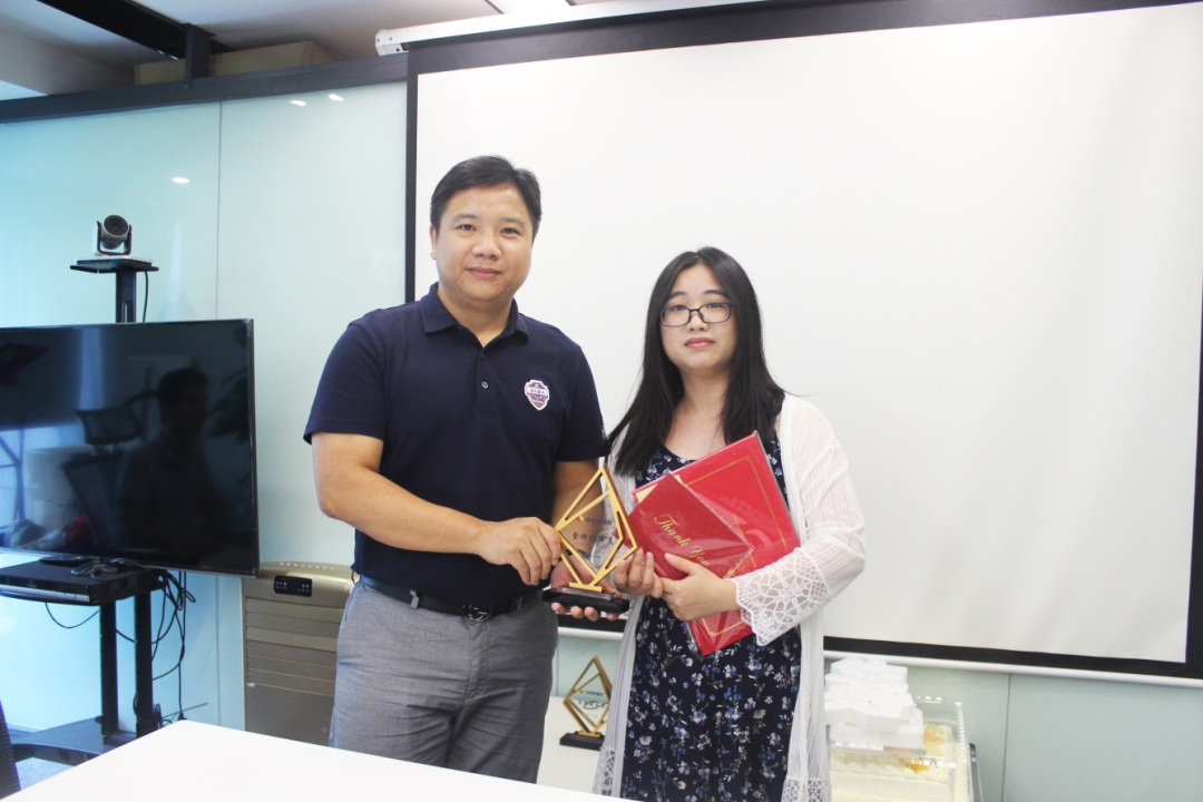 表彰大會上,由公司常務副總經(jīng)理趙倩女士為劉泉香、左有為頒發(fā)了獎杯、榮譽證書及感謝信。