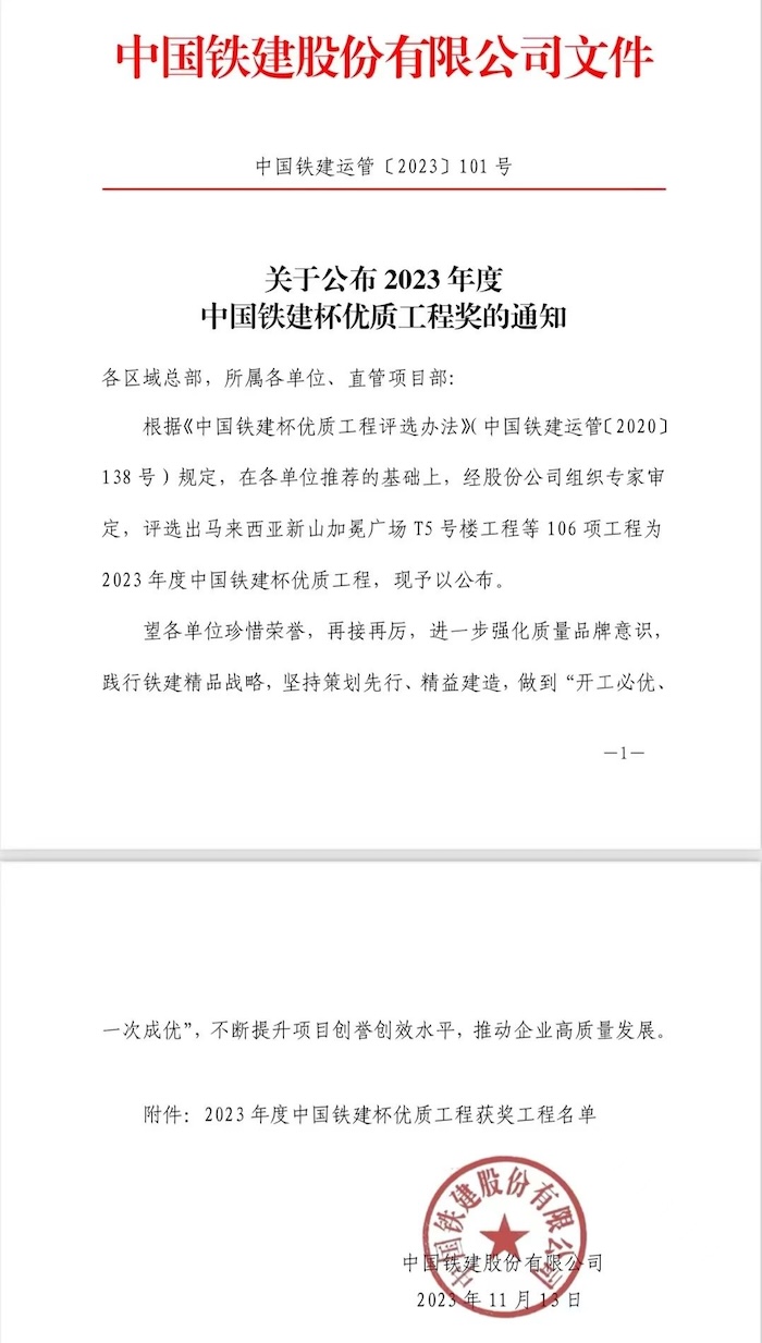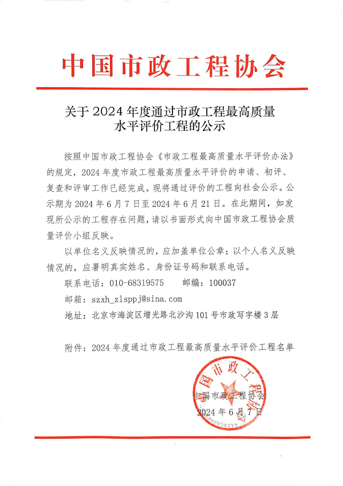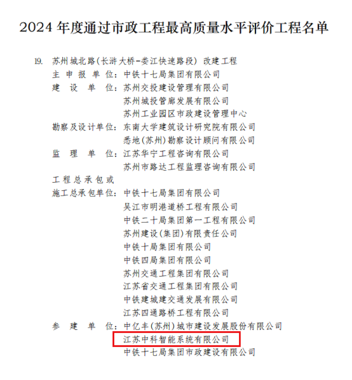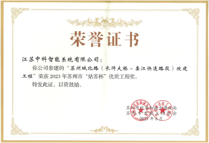 在項目建設過程中,中科智能始終堅持以“創(chuàng)建平安工地、鑄造精品工程”為目標,以質(zhì)量、安全為中心,嚴格按照施工組織方案實施,順利完成了各個系統(tǒng)的建設與交付。“市政工程最高質(zhì)量水平評價”是全國市政工程行業(yè)在工程質(zhì)量方面最高的評價獎項,代表市政工程行業(yè)同時期國內(nèi)先進水平。此次榮譽的取得,標志著中科智能在市政工程建設領域又一新收獲。同時,本項目先后榮獲過“姑蘇杯”、“鐵建杯”,體現(xiàn)了中科智能在施工管理、工程質(zhì)量、科技創(chuàng)新等方面均達到了全國市政建設行業(yè)一流水平。